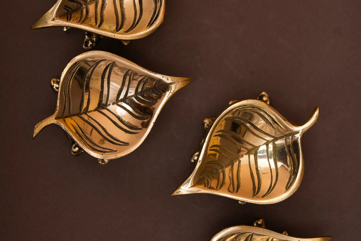 Five candleholders arc outward like blooming stems, inviting wax, flame, and shadow to do their slow, sacred work. The brass glows warm, never brash, softening the edges of a space.